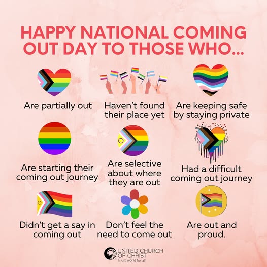 This week we also honor National Coming Out Day, which was observed yesterday, and reaffirm our identity as an Open & Affirming congregation of the United Church of Christ. To our LGBTQ+ siblings: You are beloved. You are welcome. You are not alone. Whether you are out, coming out, or still discerning your journey, we see you, we love you, and we celebrate your courage.
